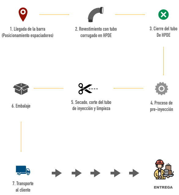 El revestimiento de las barras de HDPE pre-inyectadas no debe dañarse durante las operaciones de carga, descarga y manipulación in situ. La barra se recubre posteriormente con el tubo corrugado para garantizar la protección contra la corrosión. El tubo es de plástico acanalado y corrugado de PEHD de primera calidad, con un grosor mínimo de 1,2 mm y fabricado sin juntas.